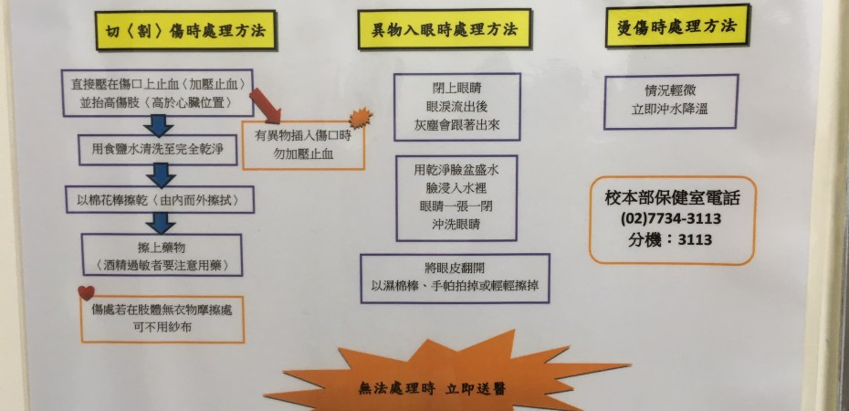 因為不是每位學生或是使用者都知道如何進行基本的急救處理或是知道校內的急救流程,因此建議在急救箱下面製作一張急救指引讓學生參考。