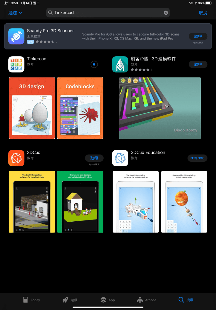 首先先在Apple Store上搜尋TinkerCAD,然後就會看到這熟悉的軟體。