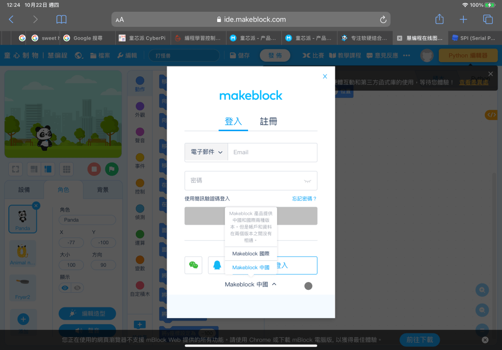 這邊個人建議,進入操作介面時,他預設值的登入是進入「中國版」的,但不知道是我自己第一次使用時的登入網頁就是國際版的?我後需登入時需要從「國際版」登入,大家也可以直接申請國際版的操作。登入後就可以將撰寫的程式直接存入雲端,也可以使用「人工智慧(AI)」、「物聯網」的操作項目。