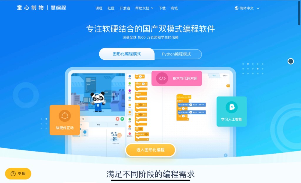 要操作CyberPi,首先我們需要先連上網站(https://mblock.makeblock.com/zh-cn/),在裡面可以先點選「圖形化編程模式」,就會進入他們的操作介面了。