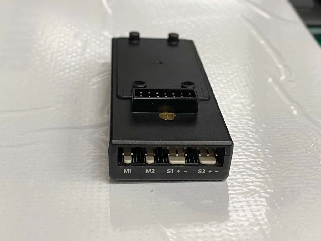 鋰電池擴展板(我覺得未來應該會再出一個很炫的名字吧?)是這個教具中我覺得很棒的一個裝置。它配備3.7V 800mA的鋰電池,並配有兩組伺服馬達的輸出接頭以及兩組直流馬達的輸出接頭,因此在課程中如果有需要,教師可以直接讓學生使用杜邦接頭連接上擴展板,就進行運作。(單一Port的最大輸出電流我在跟廠商詢問或是測試)