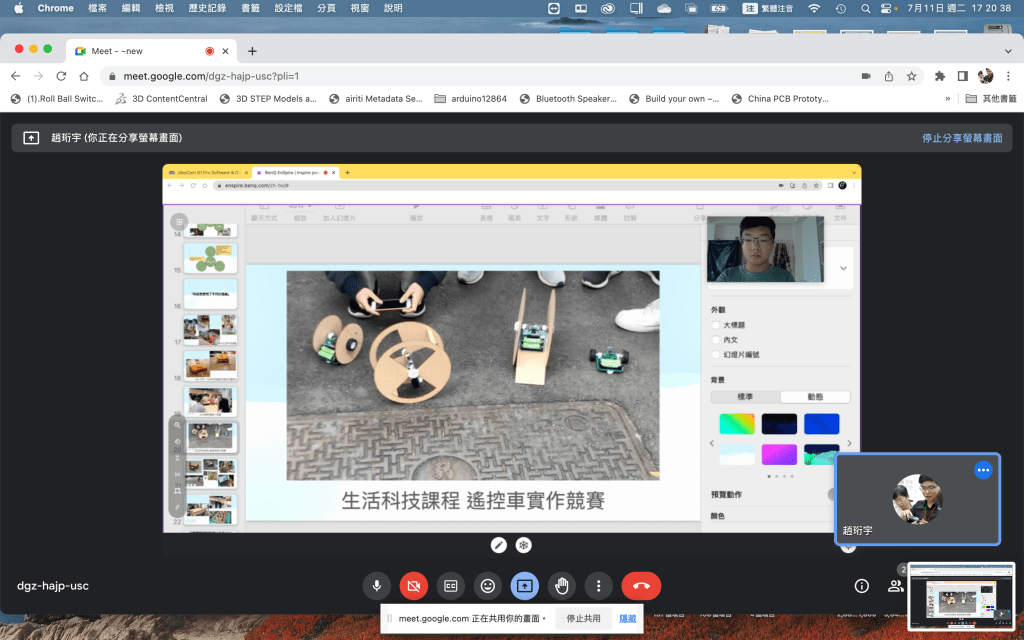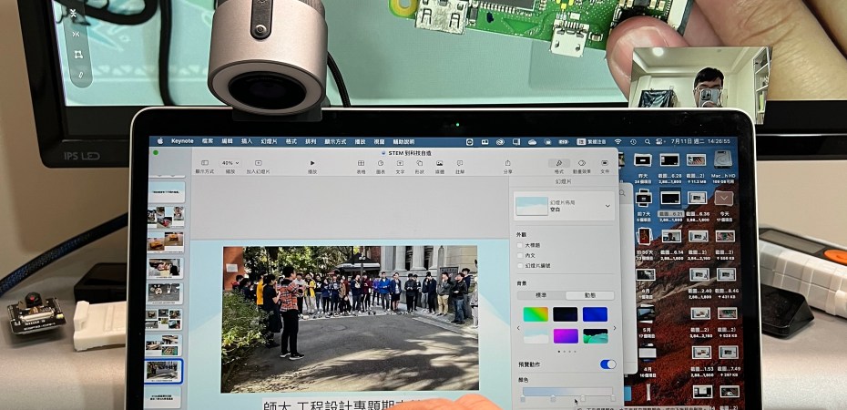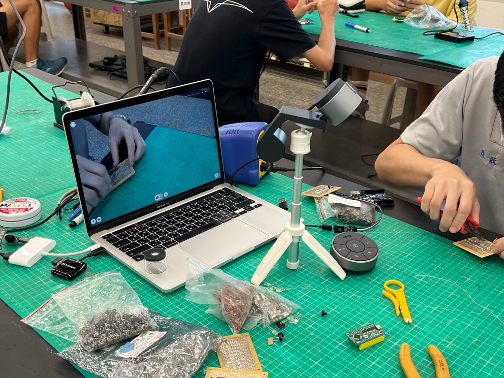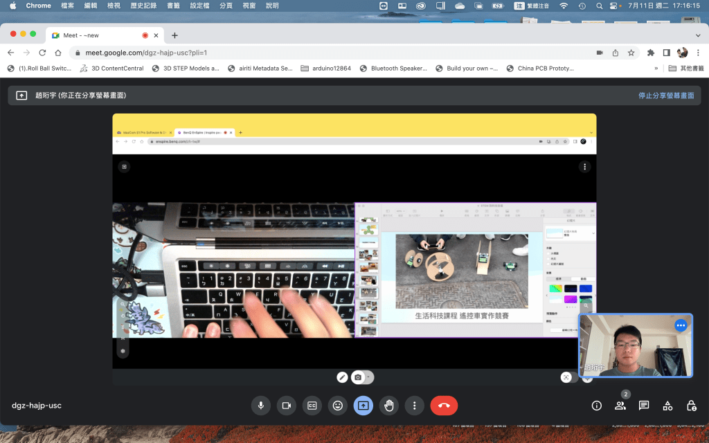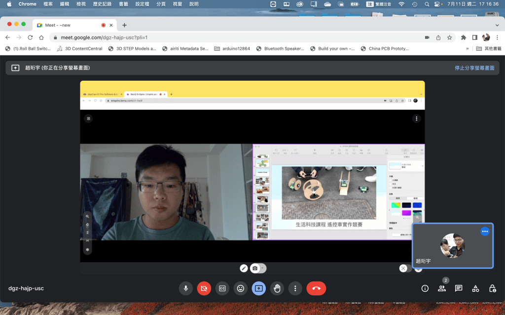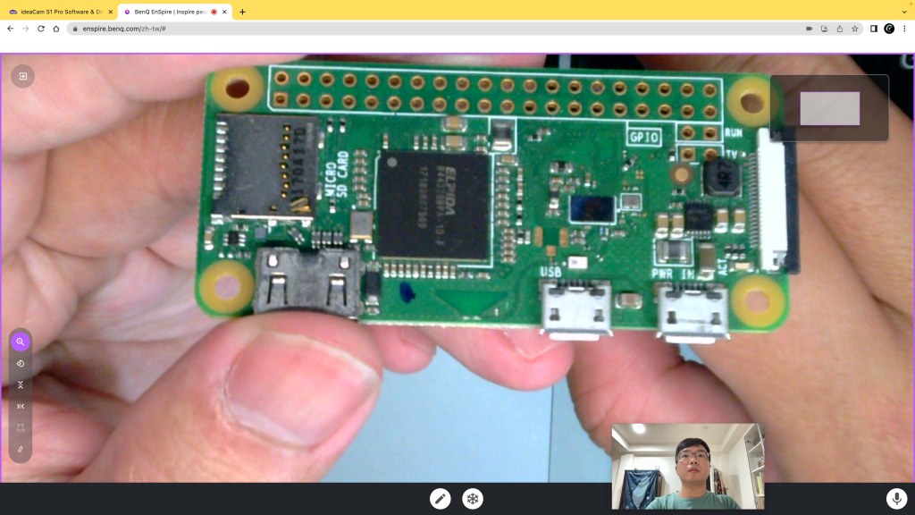 這個操作可以讓我們將要說明的物件放置在最大的畫面區域,而同時也能分享自己的動作、表情以及說明的畫面,以保持與觀看者的互動性。最常用的原因是因為,在教學時我很常需要將各種畫面放大,使同學可以更清楚我在說明的內容,如上方的電子元件、晶片烙碼等等,因此這樣的分享方式可以提供最多的資訊在其中。