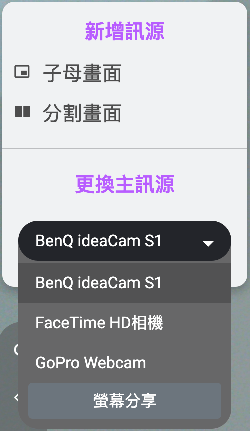 嘗試更換主訊號源的時候,應該會看到上面有兩「子母畫面」與「分割畫面」,這兩者在教學時也是很常使用到的功能,比方說要同時呈現電腦中的資料,又要演示實際操作、口語、表情、姿態等內容時,有這類的功能就會方便很多。