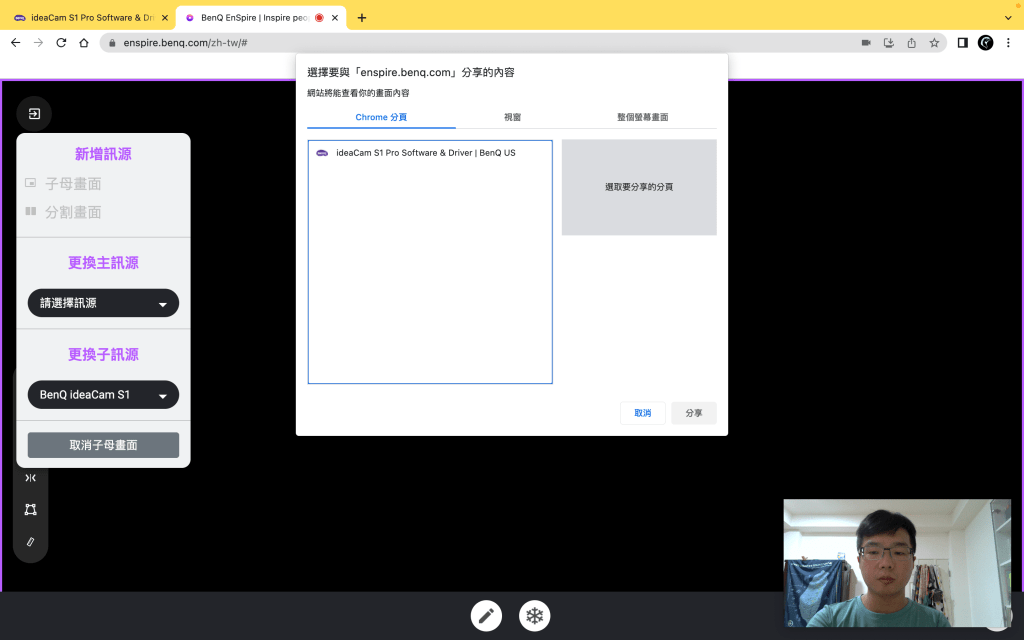 而相對來說,我的臉只是配角,所以在這樣的狀況下,選擇子母畫面就很合適,但如果今天兩方資訊都同樣重要,這時候就要用到下一個技巧「分割畫面」囉。