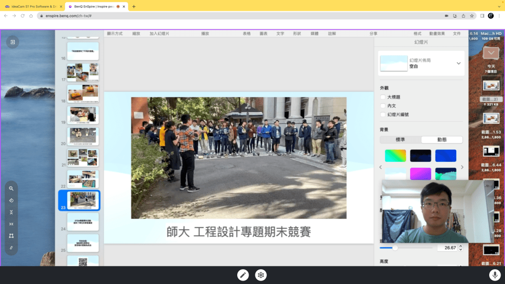 了解了以上的兩項功能,接下來只要搭配其他的線上視訊軟體如Google meet、Team、Zoom等等軟體,就可以做課程或是報告的即時分享。這邊我們使用Google meet進行授課演示,說明如何將已經設定好的EnSpire頁面進行分享,直接作為課程演示的主要畫面,不但減少網路使用流量,也可以更明確地依據分享的主題內容進行畫面的分割規劃。