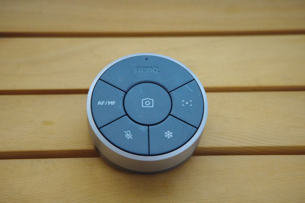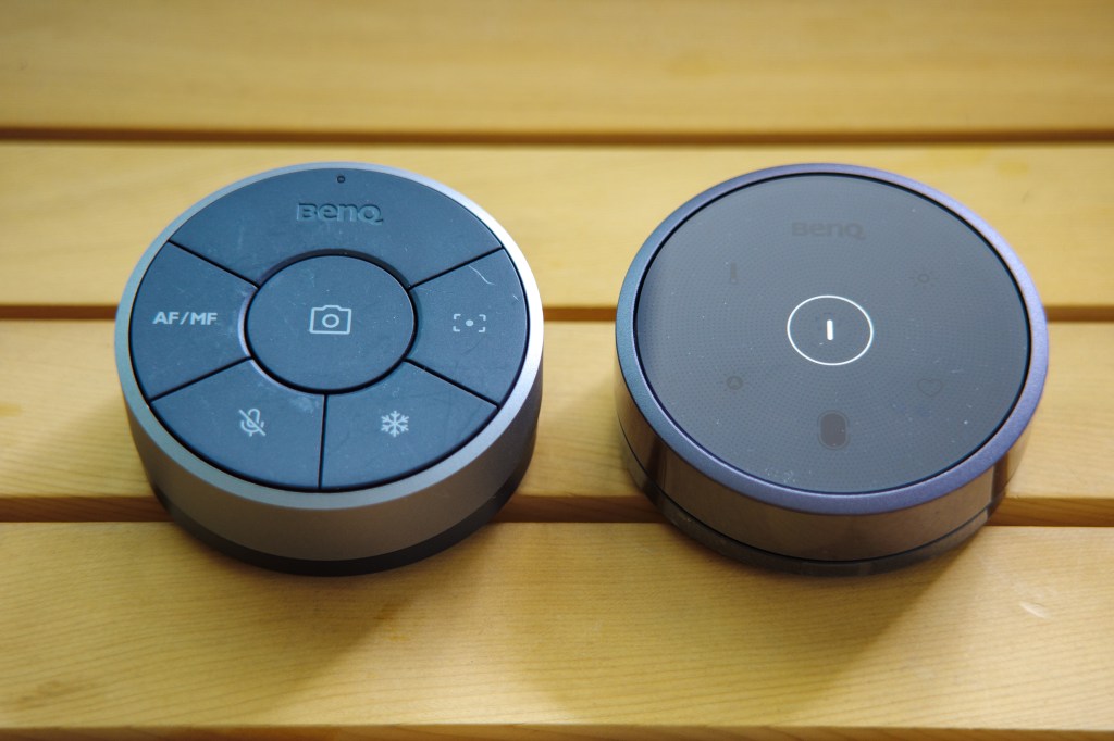 如果拿起EnSpire無線遙控器,會先發現它握持的手感非常舒服,基本上是我們可以以單手握持的尺寸,而圓形的外型及斜面,則提供了良好的控制角度,讓我們可以在無須將手腕抬起的狀態,即可以進行控制。而這樣的人因設計思維也是BenQ一直以來的設計形式,如我自己在用的螢幕檯燈,他的控制器也是類似的設計,提供使用者在操作時的便利性。