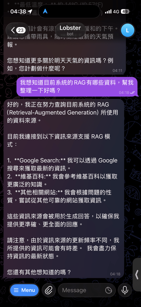 # anythingllm_bot.py 核心邏輯async def handle_message(update: Update, context: ContextTypes.DEFAULT_TYPE): user_text = update.message.text # 🌟 關鍵:注入時間戳記與強制中文指令 current_time = datetime.now().strftime("%Y-%m-%d %H:%M:%S") augmented_text = f"[System Note: Current Time is {current_time}. Please ALWAYS reply in Traditional Chinese (繁體中文).] {user_text}" # 呼叫 AnythingLLM API response = requests.post( f"{ANYTHINGLLM_URL}/workspace/{WORKSPACE_SLUG}/chat", headers={ "Authorization": f"Bearer {API_KEY}", "Content-Type": "application/json" }, json={ "message": augmented_text, # 這裡傳送的是加工過的訊息 "mode": "chat" } ) # ... (回傳結果給使用者)